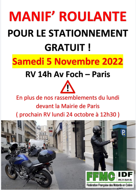 la FFMC PPC et IDF appelle à une grande manifestation, roulante celle-ci, le SAMEDI 5 novembre, avec un rendez-vous avenue Foch à 14 heures : « NON au stationnement payant, injuste et discriminatoire !